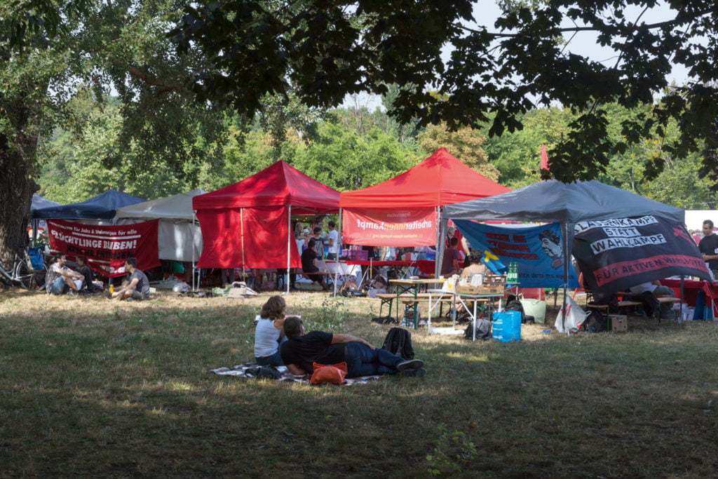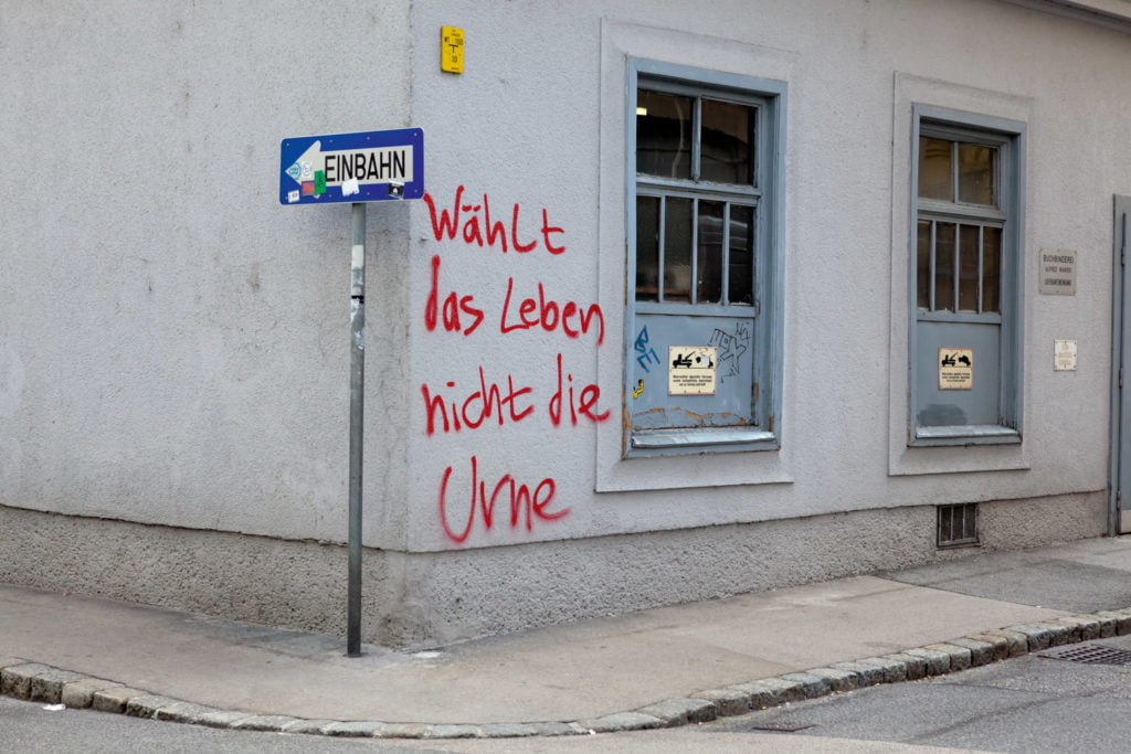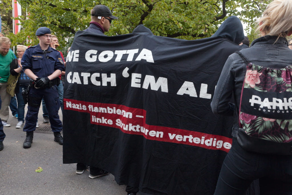 Können sich Überzeugungen im Bild nur dann manifestieren, wenn Menschen auf die Straße gehen und damit die Kontrolle über ihr fotografisches Konterfei verlieren? Die Nebelwerferinnen am Ersten Mai hat Schoeller wohl nicht zufällig als Auftakt für ihre Bildstrecke gewählt. Die stets präsenten Sprüche bei den Demonstrationen – ob auf T-Shirts, Transparenten, kleinen Zetteln oder riesigen Wandtexten – schreien ihre Botschaften heraus. Unmissverständlich, denken sich die Begeisterten wahrscheinlich, doch unbefangene BildbetrachterInnen und -betrachter (gibt es so etwas denn überhaupt?) müssen sich wohl fragen, was „Nazis flambieren“ bedeuten soll, oder warum das rot-weiß-rote Band mit der blauen Aufschrift „Aus Liebe zur Heimat“ bevorzugt vors Gesicht gehalten wird.