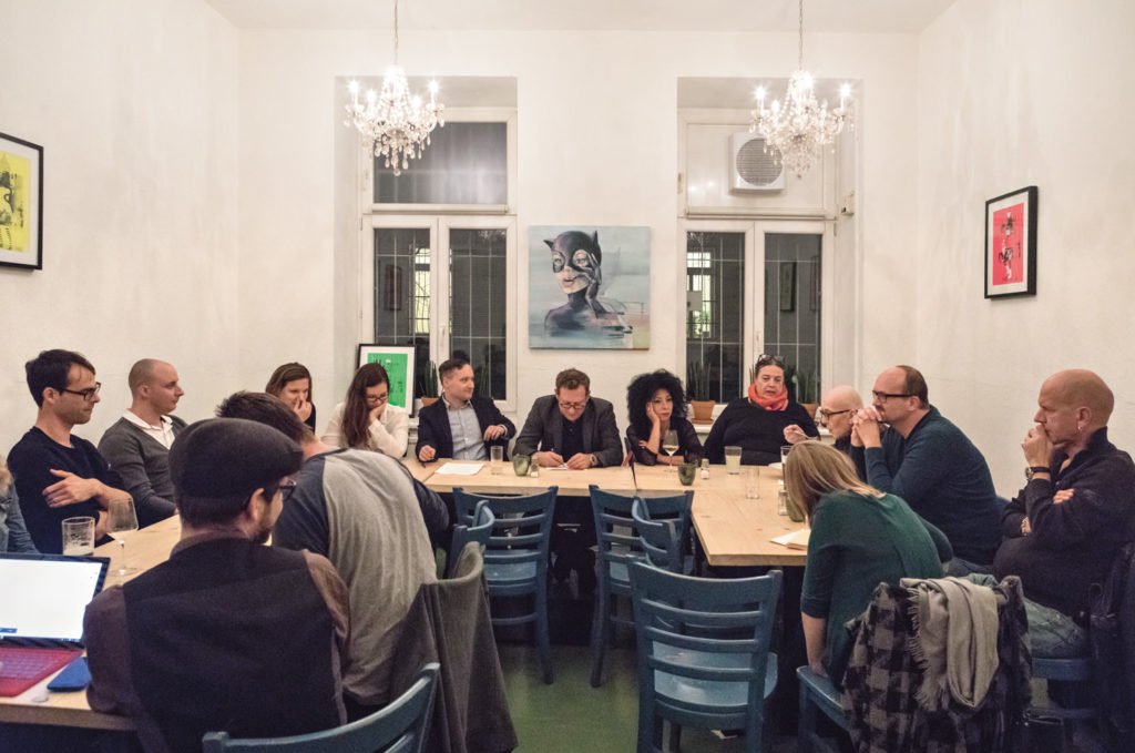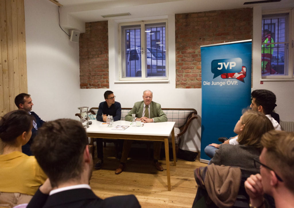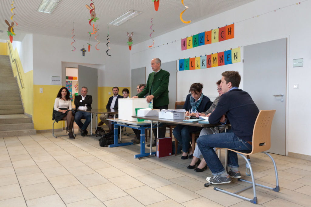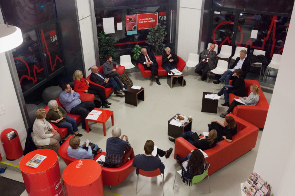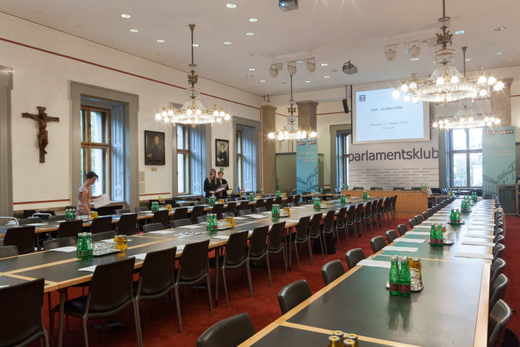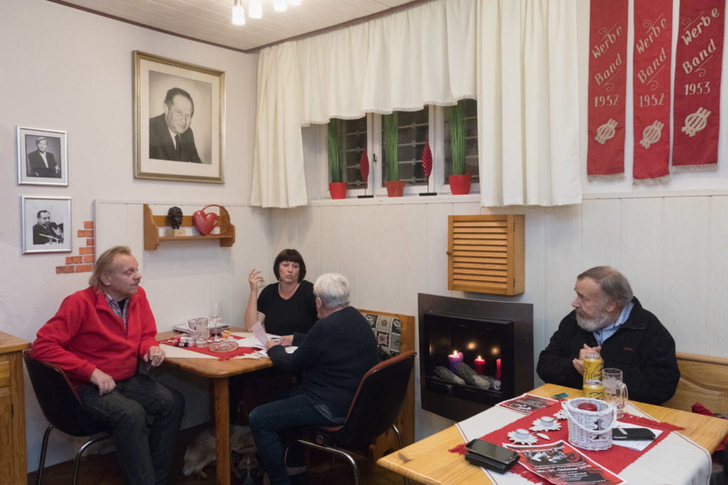 Schoeller hat allerdings – teils gezielt, teils unwillkürlich, wie sie sagt – den genau Schauenden auch im kontrollierten Gelände einiges Erhellendes zu bieten, hat Versammlungsräume zum Sprechen gebracht. Nicht alles scheint von den dort Tagenden tatsächlich bewusst bestimmt zu werden: Bruno Kreiskys Porträt oder das Kruzifix als im Hintergrund stets präsente Überfiguren wirken geplant, aber was macht der grüne Sesselrücken im roten Bezirkslokal? Und sollen wir aus dem ausschließlich weiblich- jugendlichen Personal im schwarzen Parlamentsklub auf die wahren Entscheidungsträger in der Partei schließen? „Da schau her, was der macht“ als kleines Plakat hinter den Vorsitzenden einer Runde wohl nur auf den ersten Blick gleichberechtigter Teilnehmer und Teilnehmerinnen muss uns als Aufruf dienen, genau hinzusehen und mit Ironie zu interpretieren, was uns in Bildern dargeboten wird – die Aufregung darüber, dass in dem von Schoeller dokumentierten politischen Umfeld in Österreich 2016 erstmals eine Bundespräsidentenwahl annulliert wurde, lässt sich mit allen Implikationen nicht fotografieren, sondern muss als Hintergrund aller Bilder stets mitgedacht werden.