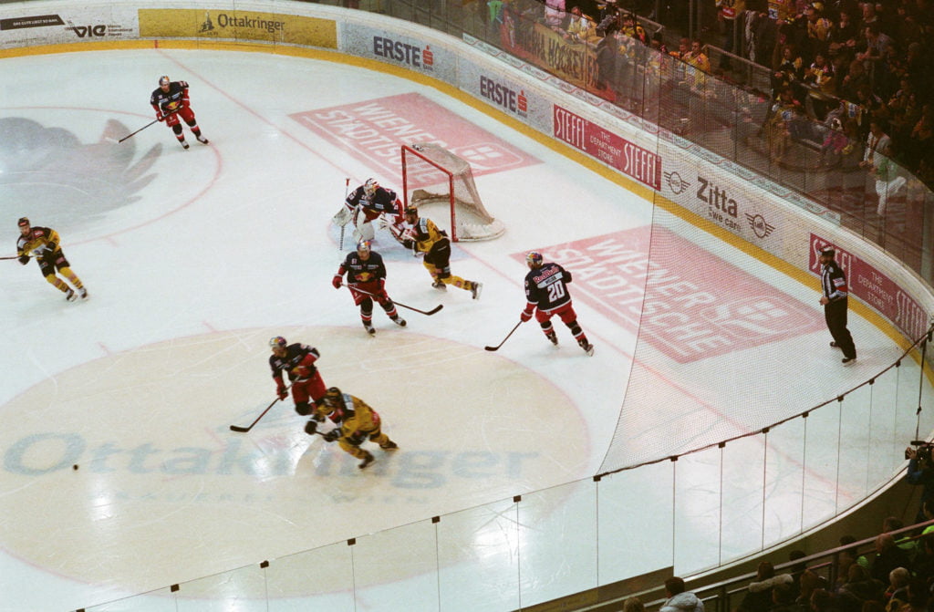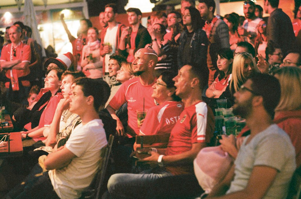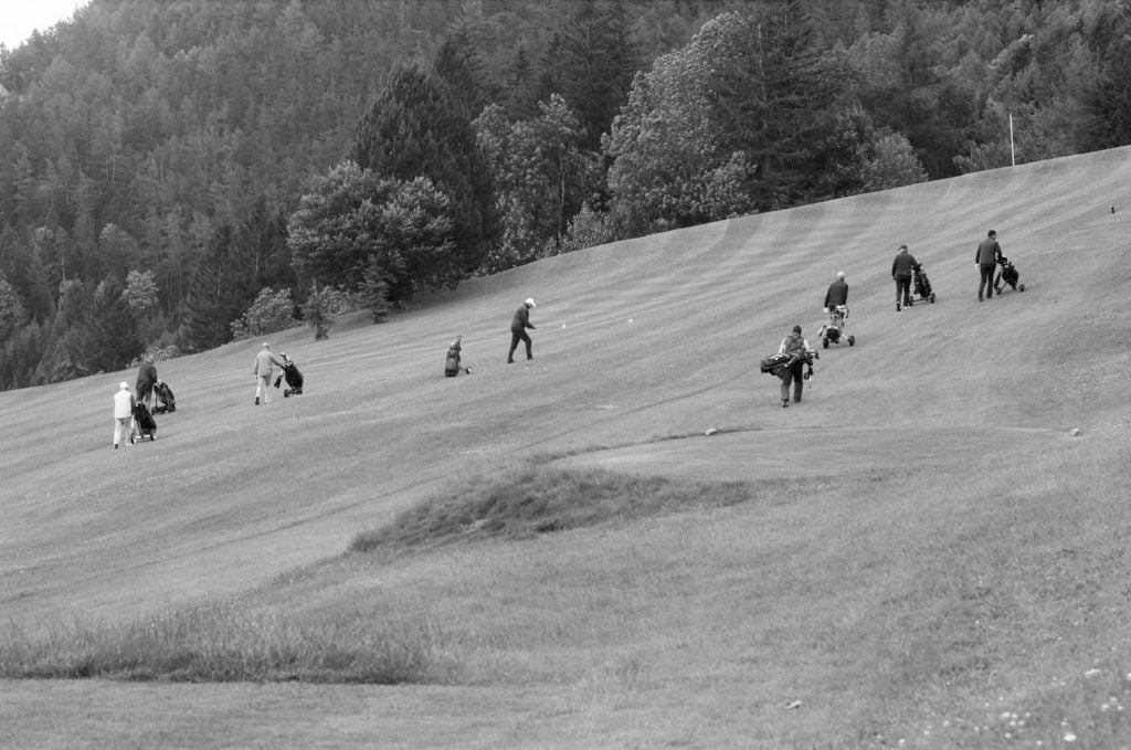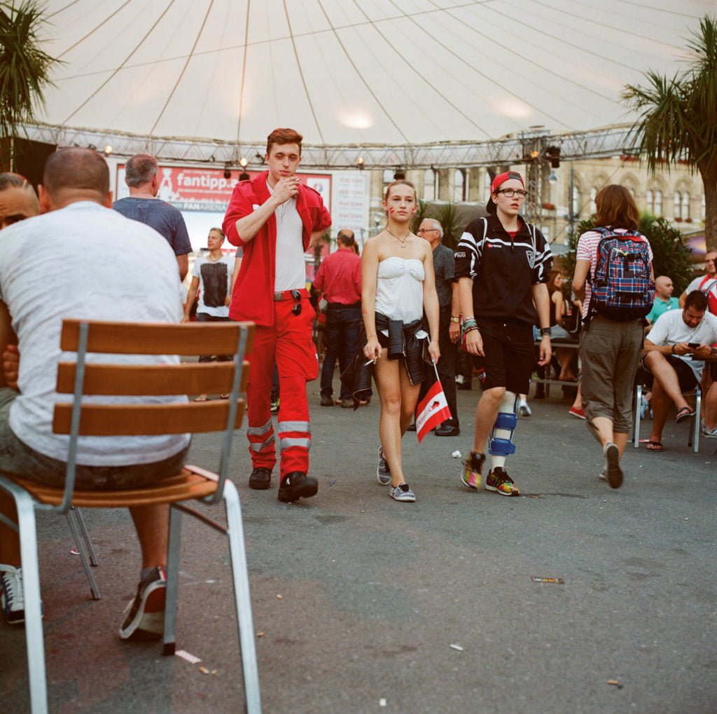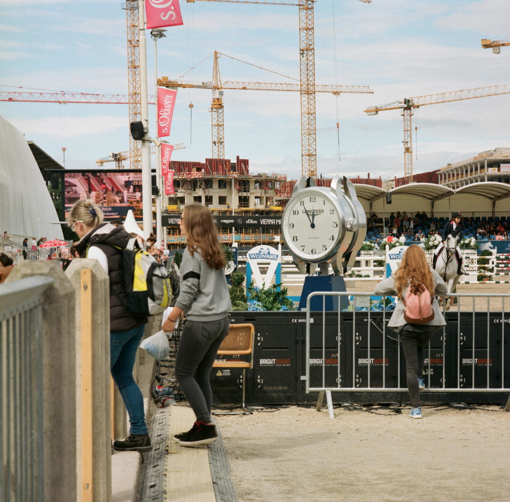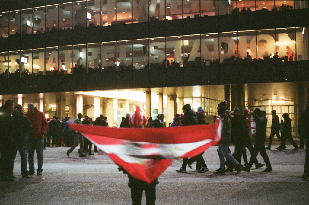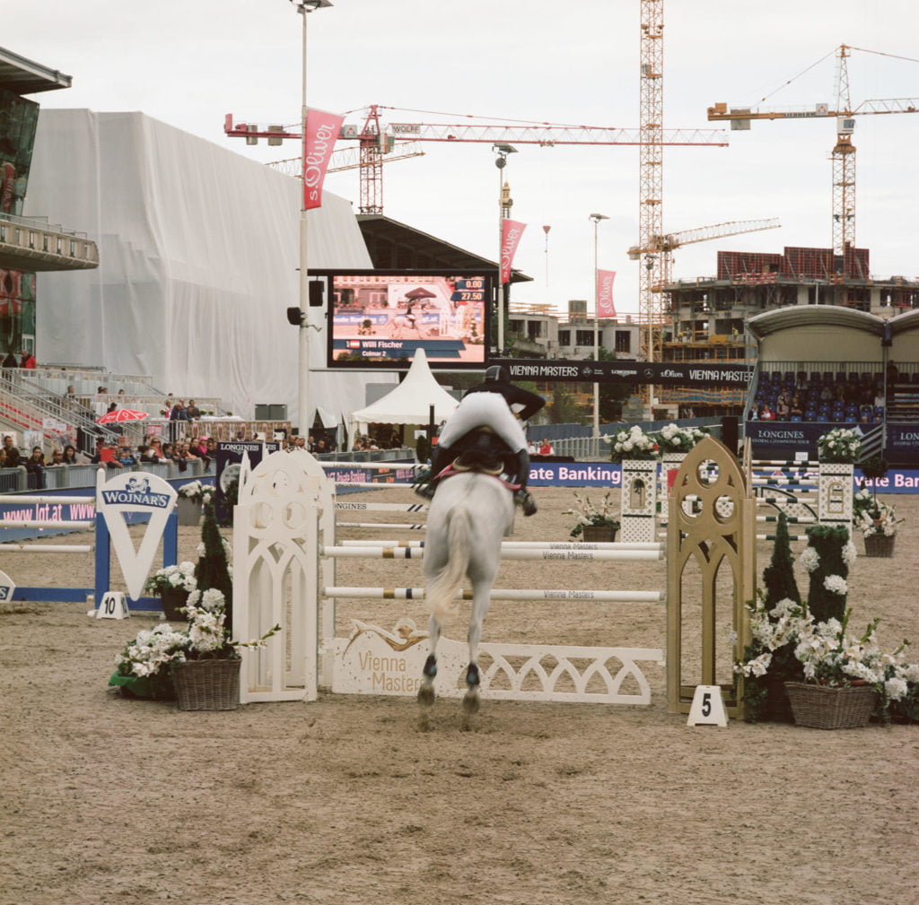 Austrians love their sports, but they are not alone in that. In Austria as in any other country, certain sports are seen as shaping the country’s sense of its own identity, and those sports are celebrated with a special affection. Austria is traditionally associated with winter sports, especially alpine sports. But with the exception of a few mainstream sports, Heidi Harsieber’s take on sport in Austria focuses mainly on sports that receive less media attention; indeed, as a general rule, she is not particularly interested in things that have been seen a thousand times before. Her photographs of events, training sessions and recreational sports are testimony to unconventional perspectives on popular sporting disciplines such as football, ice hockey and tennis, but also so-called niche sports such as archery. Harsieber embraces them all with the same fascination as she does major fixtures at the Ernst Happel football stadium in Vienna. The photographer’s curiosity about the sensuality of the bodies in motion and the emotional, intersubjective moods of the spectators is apparent in her consistently atypical perspectives, the calm and the concentration with which she captures these dynamic situations on film in a process that is exclusively analogue. In sport, Harsieber is not looking just for sporting feats and virtuosity, as is commonly the case; rather, she is interested first and foremost in the passion of the protagonists, the unexpected and unpredictable, the side effects, but also the moments of failure. Thus an ice hockey game might feature the painful moment when a player has to leave the stage following an injury. The focal point of another photograph is not trained on the divers floating majestically through the water, but on their somewhat clumsy exit from the water onto the shore. In Harsieber’s photographs, tennis becomes a choreography played out between grids and boxes. While the spectators remain quietly and fixedly seated within the confines of their stands, the ball boys kneel before the players as they give it their all. Archery is suddenly recognisable as a game of strategy, just as kayakers and canoeists become conquerors of the country’s native waters. At Vienna’s Krieau horseracing track the ballet of building cranes competes head to head with the lissom horses. Elsewhere social contrasts collide in the juxtaposition of golf and volleyball. While the golfers basking in the exclusive seclusion of Austria’s oldest golf course at the Semmering do not wish to be disturbed by the photographer, in a public space in Vienna she is able to get close to the volleyball game being played out by Nepalese women, watched by their husbands. The photographer’s interest in, and keen sensitivity for, the psychological dynamics in human gatherings are particularly in evidence in the two football double-pages. They depict the mass euphoria and deep emotional downer felt by fans after a defeat during a public viewing as well as the now ubiquitous control and security aspect at major fixtures. The photographer also pays tribute to disabled sport, which all too often is showcased only during Paralympics events. Even in the age of media voyeurism she restores a touch of normality to it, with one of the photos giving no indication whatsoever that the female athlete is in fact physically impaired.
