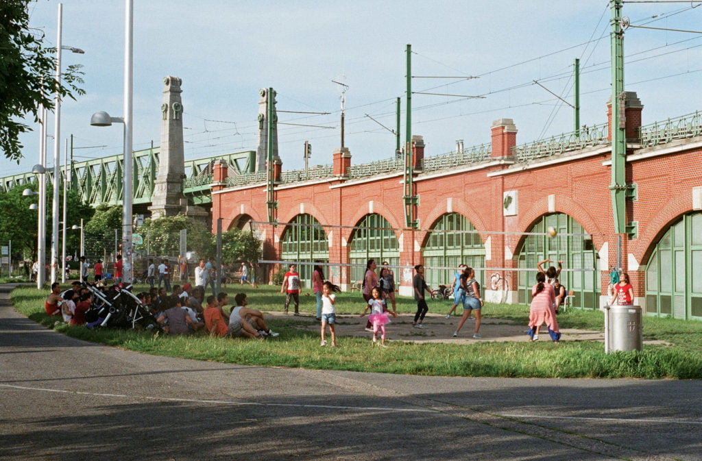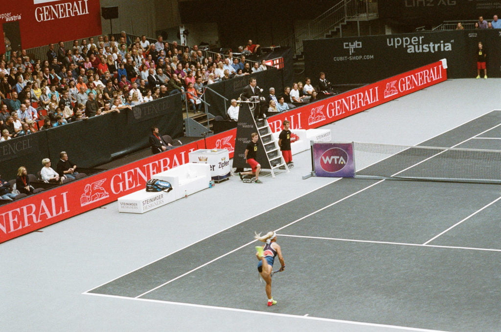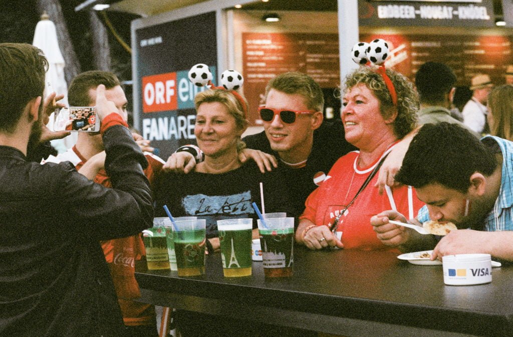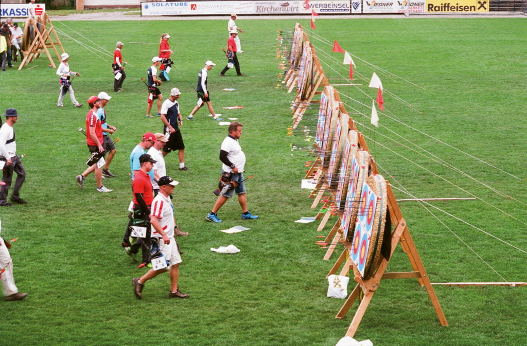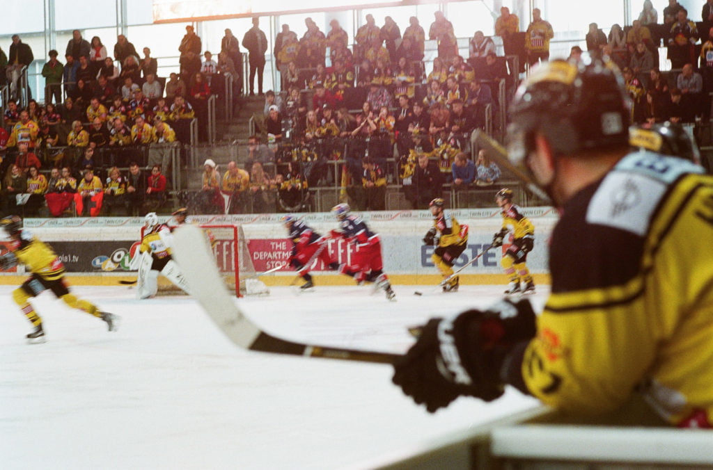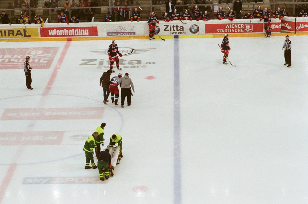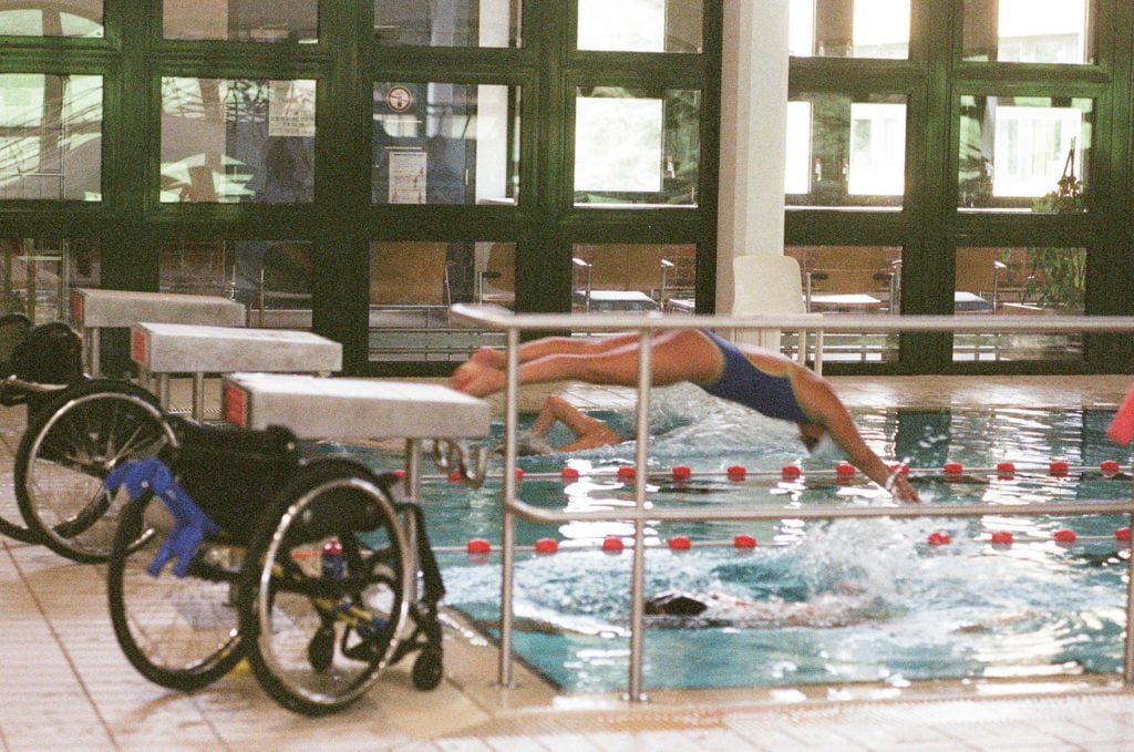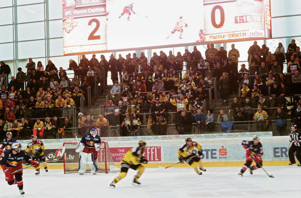 Austrians love their sports, but they are not alone in that. In Austria as in any other country, certain sports are seen as shaping the country’s sense of its own identity, and those sports are celebrated with a special affection. Austria is traditionally associated with winter sports, especially alpine sports. But with the exception of a few mainstream sports, Heidi Harsieber’s take on sport in Austria focuses mainly on sports that receive less media attention; indeed, as a general rule, she is not particularly interested in things that have been seen a thousand times before. Her photographs of events, training sessions and recreational sports are testimony to unconventional perspectives on popular sporting disciplines such as football, ice hockey and tennis, but also so-called niche sports such as archery. Harsieber embraces them all with the same fascination as she does major fixtures at the Ernst Happel football stadium in Vienna. The photographer’s curiosity about the sensuality of the bodies in motion and the emotional, intersubjective moods of the spectators is apparent in her consistently atypical perspectives, the calm and the concentration with which she captures these dynamic situations on film in a process that is exclusively analogue. In sport, Harsieber is not looking just for sporting feats and virtuosity, as is commonly the case; rather, she is interested first and foremost in the passion of the protagonists, the unexpected and unpredictable, the side effects, but also the moments of failure. Thus an ice hockey game might feature the painful moment when a player has to leave the stage following an injury. The focal point of another photograph is not trained on the divers floating majestically through the water, but on their somewhat clumsy exit from the water onto the shore. In Harsieber’s photographs, tennis becomes a choreography played out between grids and boxes. While the spectators remain quietly and fixedly seated within the confines of their stands, the ball boys kneel before the players as they give it their all. Archery is suddenly recognisable as a game of strategy, just as kayakers and canoeists become conquerors of the country’s native waters. At Vienna’s Krieau horseracing track the ballet of building cranes competes head to head with the lissom horses. Elsewhere social contrasts collide in the juxtaposition of golf and volleyball. While the golfers basking in the exclusive seclusion of Austria’s oldest golf course at the Semmering do not wish to be disturbed by the photographer, in a public space in Vienna she is able to get close to the volleyball game being played out by Nepalese women, watched by their husbands. The photographer’s interest in, and keen sensitivity for, the psychological dynamics in human gatherings are particularly in evidence in the two football double-pages. They depict the mass euphoria and deep emotional downer felt by fans after a defeat during a public viewing as well as the now ubiquitous control and security aspect at major fixtures. The photographer also pays tribute to disabled sport, which all too often is showcased only during Paralympics events. Even in the age of media voyeurism she restores a touch of normality to it, with one of the photos giving no indication whatsoever that the female athlete is in fact physically impaired.