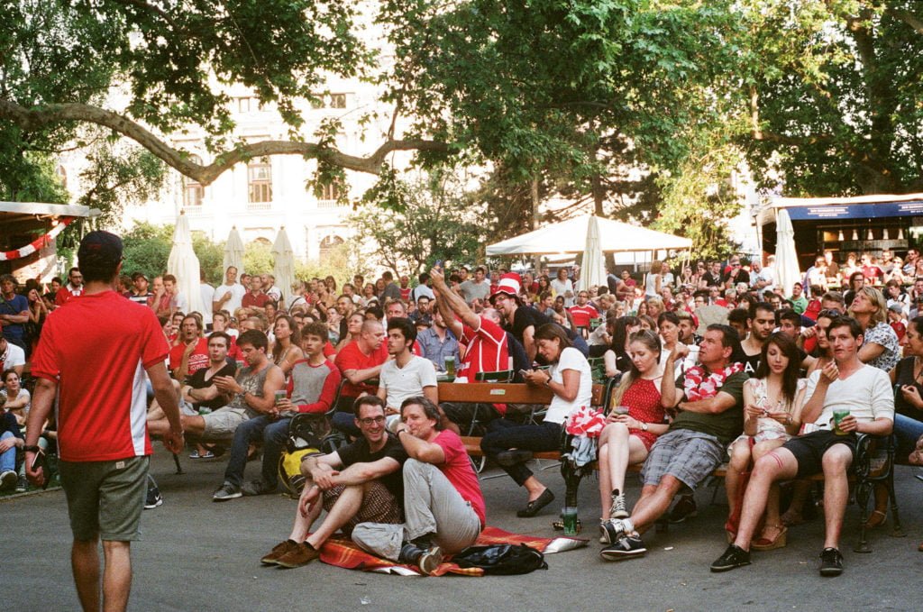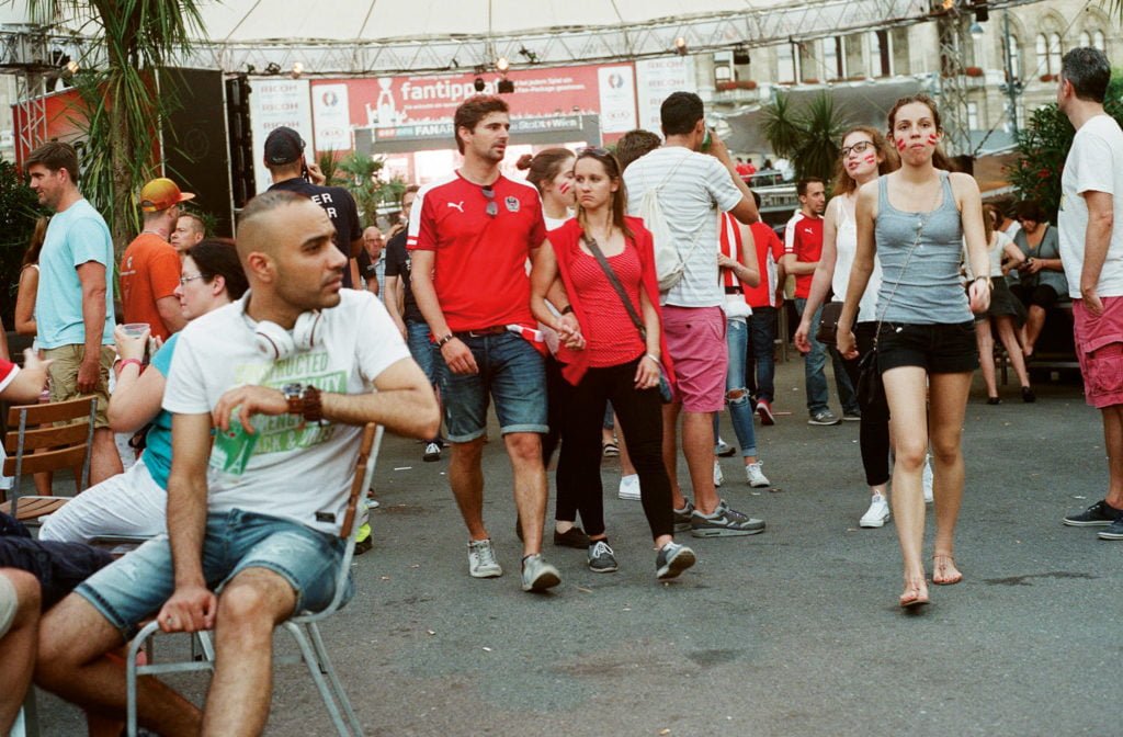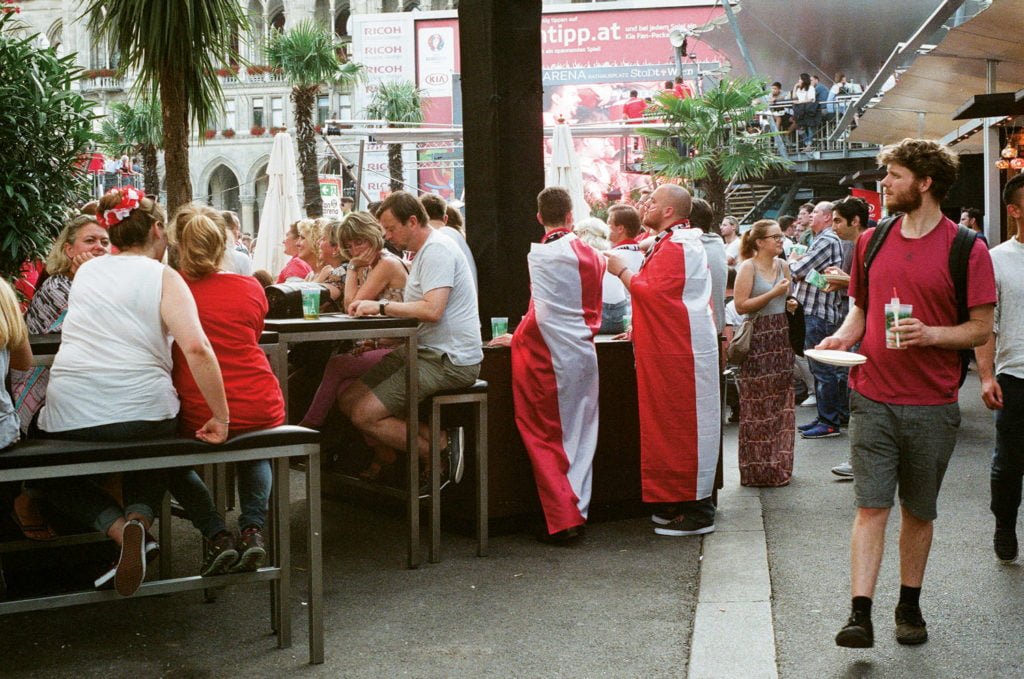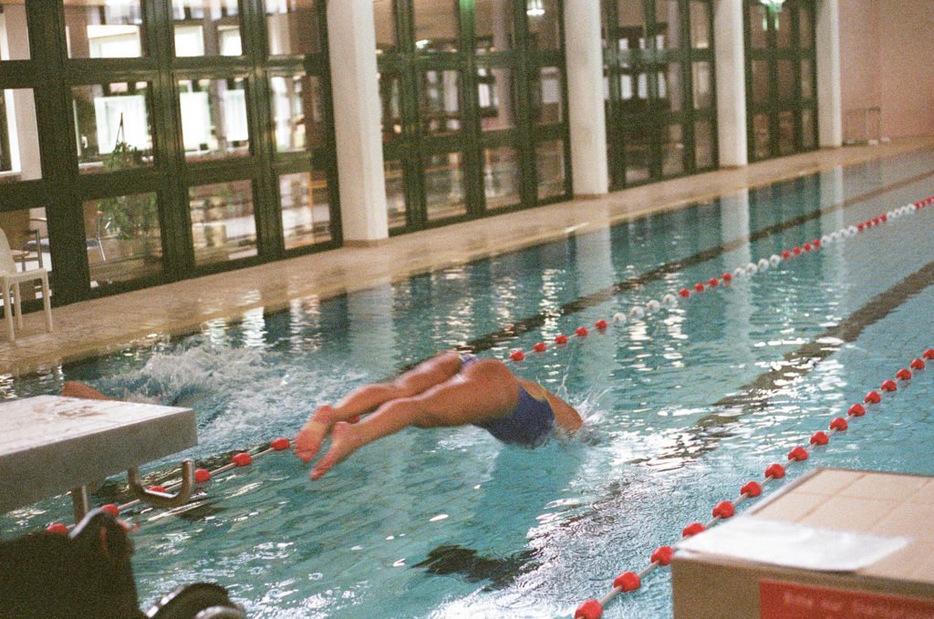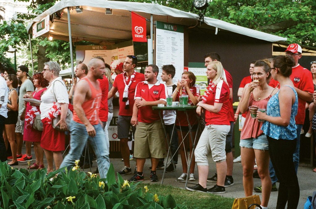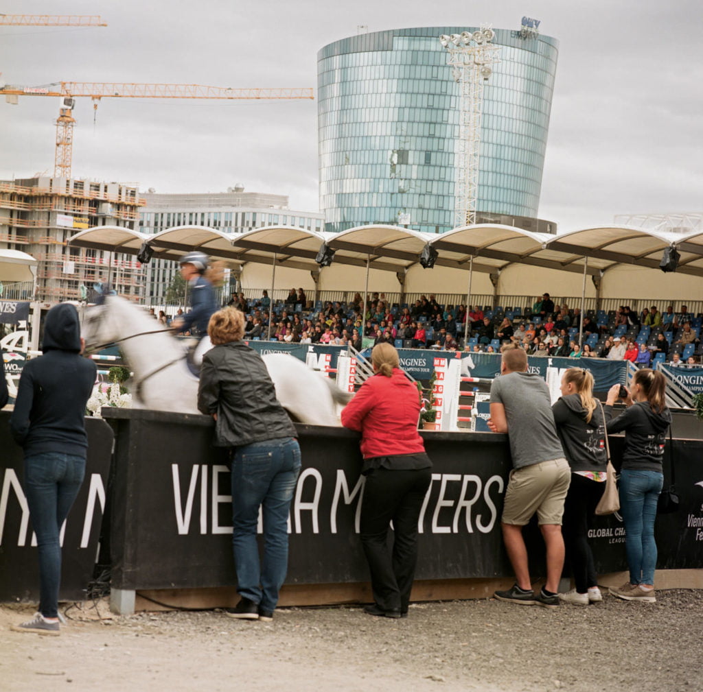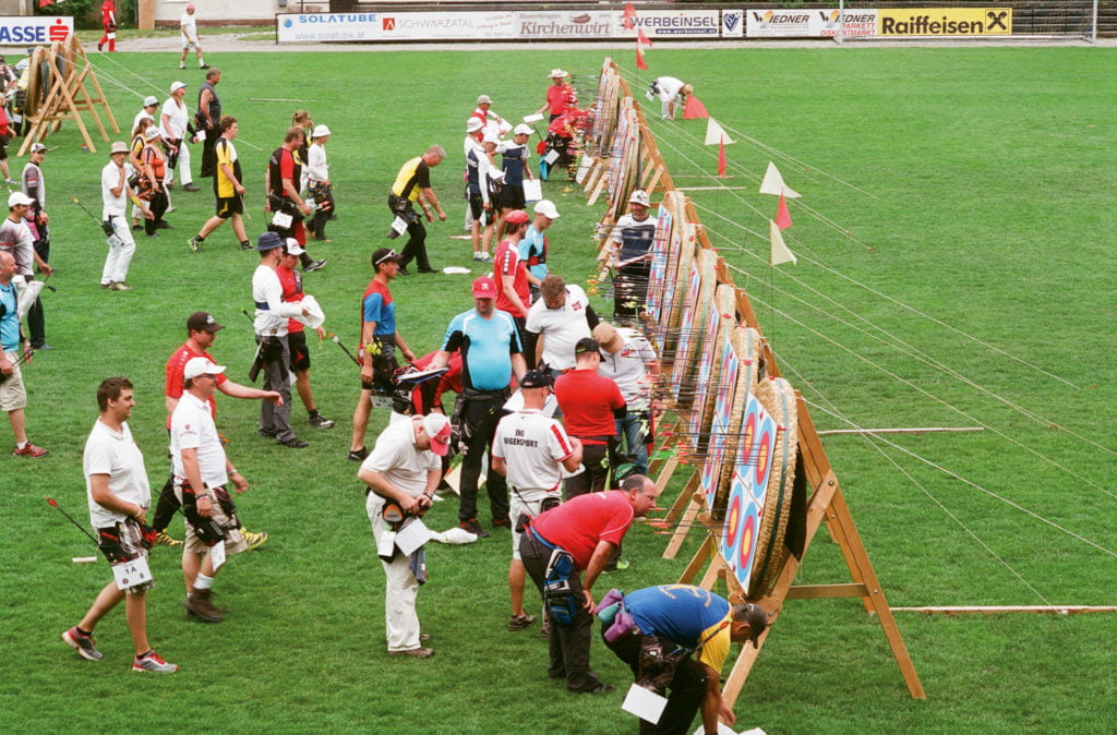 Austrians love their sports, but they are not alone in that. In Austria as in any other country, certain sports are seen as shaping the country’s sense of its own identity, and those sports are celebrated with a special affection. Austria is traditionally associated with winter sports, especially alpine sports. But with the exception of a few mainstream sports, Heidi Harsieber’s take on sport in Austria focuses mainly on sports that receive less media attention; indeed, as a general rule, she is not particularly interested in things that have been seen a thousand times before. Her photographs of events, training sessions and recreational sports are testimony to unconventional perspectives on popular sporting disciplines such as football, ice hockey and tennis, but also so-called niche sports such as archery. Harsieber embraces them all with the same fascination as she does major fixtures at the Ernst Happel football stadium in Vienna. The photographer’s curiosity about the sensuality of the bodies in motion and the emotional, intersubjective moods of the spectators is apparent in her consistently atypical perspectives, the calm and the concentration with which she captures these dynamic situations on film in a process that is exclusively analogue. In sport, Harsieber is not looking just for sporting feats and virtuosity, as is commonly the case; rather, she is interested first and foremost in the passion of the protagonists, the unexpected and unpredictable, the side effects, but also the moments of failure. Thus an ice hockey game might feature the painful moment when a player has to leave the stage following an injury. The focal point of another photograph is not trained on the divers floating majestically through the water, but on their somewhat clumsy exit from the water onto the shore. In Harsieber’s photographs, tennis becomes a choreography played out between grids and boxes. While the spectators remain quietly and fixedly seated within the confines of their stands, the ball boys kneel before the players as they give it their all. Archery is suddenly recognisable as a game of strategy, just as kayakers and canoeists become conquerors of the country’s native waters. At Vienna’s Krieau horseracing track the ballet of building cranes competes head to head with the lissom horses. Elsewhere social contrasts collide in the juxtaposition of golf and volleyball. While the golfers basking in the exclusive seclusion of Austria’s oldest golf course at the Semmering do not wish to be disturbed by the photographer, in a public space in Vienna she is able to get close to the volleyball game being played out by Nepalese women, watched by their husbands. The photographer’s interest in, and keen sensitivity for, the psychological dynamics in human gatherings are particularly in evidence in the two football double-pages. They depict the mass euphoria and deep emotional downer felt by fans after a defeat during a public viewing as well as the now ubiquitous control and security aspect at major fixtures. The photographer also pays tribute to disabled sport, which all too often is showcased only during Paralympics events. Even in the age of media voyeurism she restores a touch of normality to it, with one of the photos giving no indication whatsoever that the female athlete is in fact physically impaired.