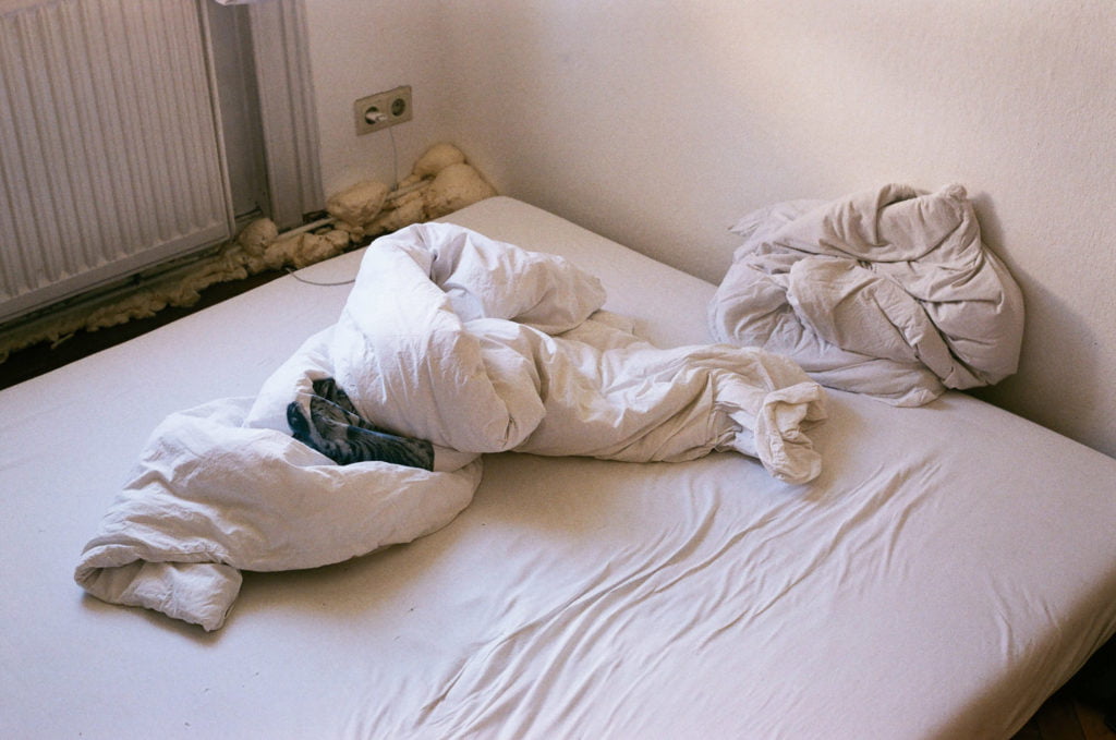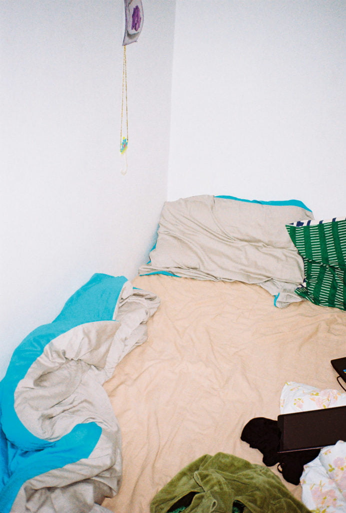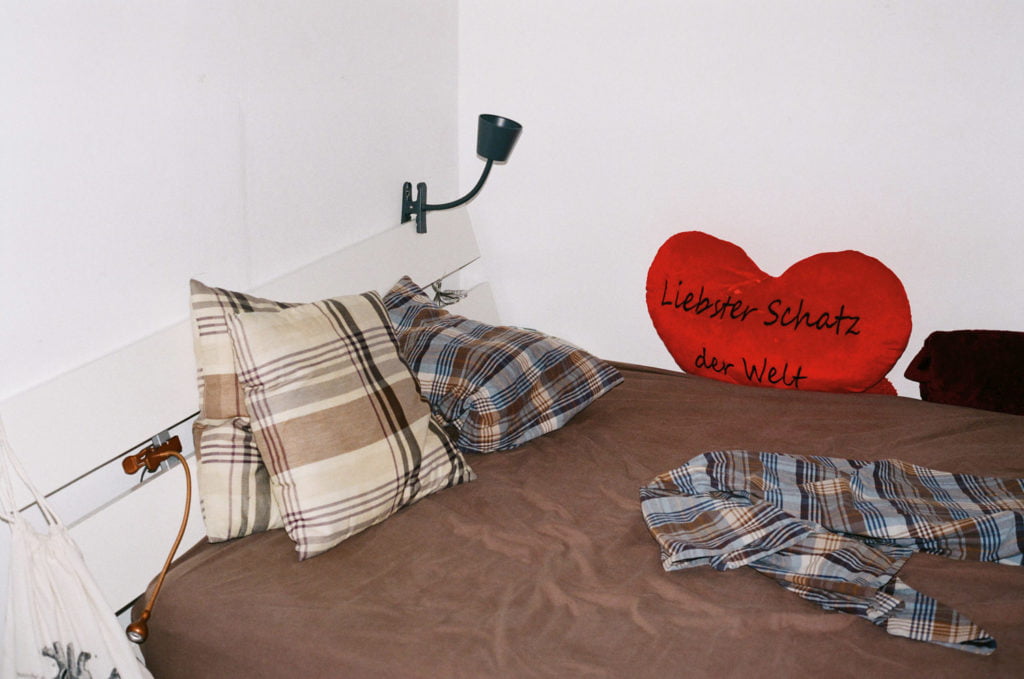 Indeed, Home No Home is the title of the book in which she has structured the photographs of this biographical – not to say migrant – return. A book that remains personal, fragmentary and excerpt-like, just as the photographs remain largely excerpt- like. They offer no overview; what they depict cannot be attributed to any particular location: façade elements, windows, views of inner courtyards as typical as they are unspecific, unmade beds, tights carelessly discarded next to a table lamp on the floor, a magazine, a water glass on the coffee table in front of a sofa used for an overnight stay, a wrapped-up photograph. Nothing in these images points to a sense of permanence in living conditions; one temporary state appears to have replaced another temporary state; the non-home is followed by no home. The photographs look as if they were taken in passing, and yet they attest to a precision in representing the provisional, the ephemeral and the incidental – an order of images that is neither complete nor does it assert or claim to assert a truth, a questioning of fragile and volatile realities.
