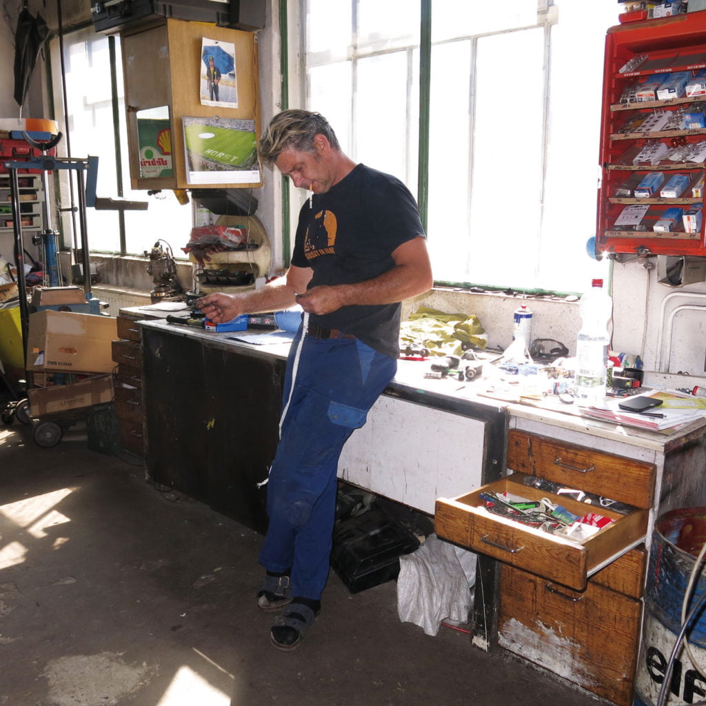 Cars plays a certain role in my life. For purely sentimental reasons, because of their beauty or the memories associated with them, I’ve owned a number of old cars and occasionally I drive them – when they’re running. Calling in at my car mechanic’s garage is often an urgent necessity, but at the same time it’s always an enjoyable affair. Two people work in this small workshop: the owner and the mechanic, who’s a real expert in vintage cars. Both are enthusiastic car collectors. Horst, the mechanic, also makes sculptures out of unusable car parts. The garage is located on the outskirts of Graz, in what was once agricultural land but is now slowing becoming an industrial zone, not far from the airport. It’s something of a rallying point for car owners who share a fascination and a passion for cars with the two people responsible for all the repairs and servicing work.