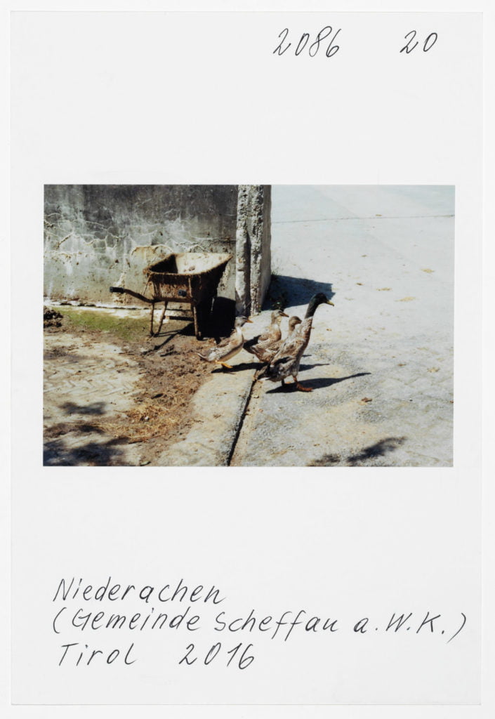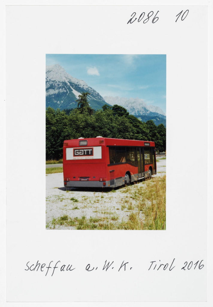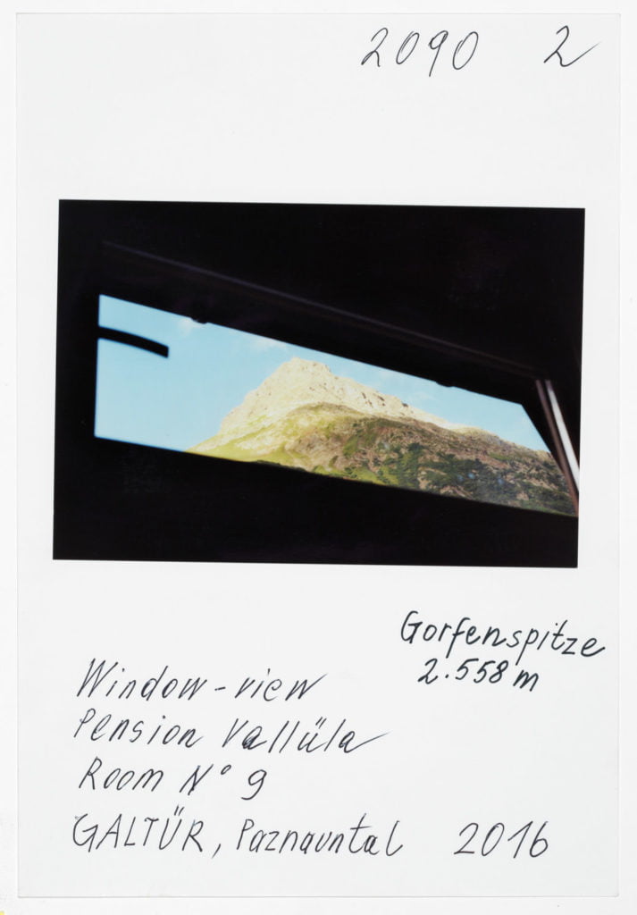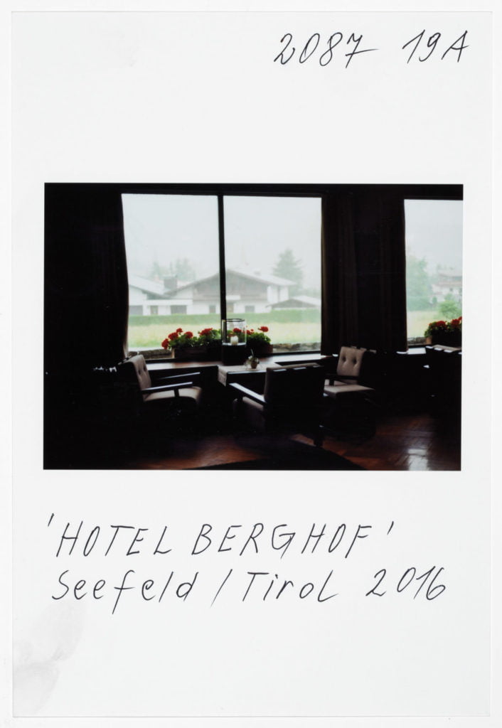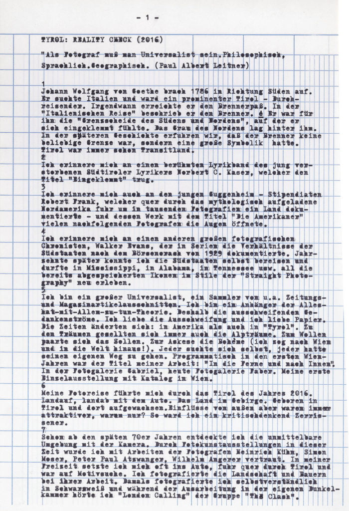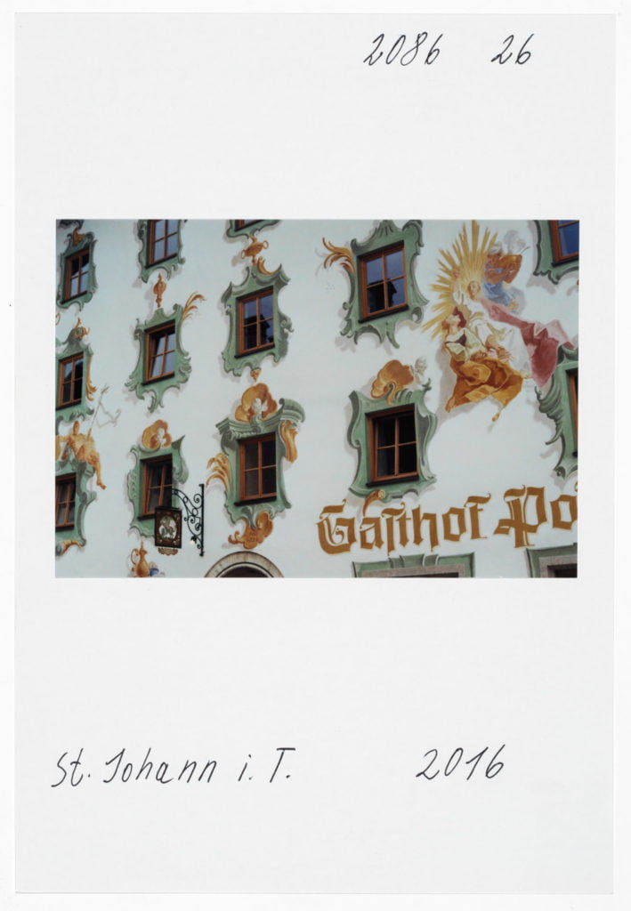 At Hotel Berghof in Seefeld, a landmark of alpine Bauhaus architecture, the traveller’s gaze appears to linger on the elegant interior before returning to the world outside, beyond the panoramic window; no look back in anger, but one filled with empathy. The Tyrolean photographs combine into an oeuvre of astounding and ever expanding diversity. As exuberant and unfathomable as it may now be, with a profusion over which Leitner seeks in vain to gain control through systematic classifications, groupings and themes, his work is nonetheless borne by a consistent artistic approach, a way of working and thinking which he himself has expressed in a number of phrases. It is certainly worth quoting and interpreting some of Leitner’s key programmatic comments here. First and foremost, a core statement by Leitner on the pace at which he works and lives his life, specifically: ‘The best pace for a photographer is walking pace.’ Indeed, Leitner is the flâneur among photographers; any haste is alien to him; he lets himself drift as he sets off in search of motifs. In Tyrol he covered 671 km in a hired car to do his on-site ‘photo rounds’, as he calls them. Leitner ‘be-strides’ his world, hours and days at a time, wherever he happens to be. His work method is based on slowness and exactness. For someone hot on the heels of the serendipitous, he takes his time. He once quoted Hartmut Böhme in an interview: ‘The flâneur does not pick the fastest route from A to B; he much prefers the odysseys of pure chance.’[ref]Hartmut Böhme, Schildkröten spazieren führen, in: Neue Zürcher Zeitung, May 19th, 2007, online: http://www.nzz.ch/articleF2LNV-1.361104. [/ref] Of course, it goes without saying that commercial constraints, commissions, purposes, and schedules are completely alien to him, just as he has no interest whatsoever in the swiftness and arbitrariness of digital photography. With his belief in the uniqueness of an image, his world has remained analogue to this day. He makes his decisions before and during the photograph; he selects his images meticulously while photographing, not afterwards. What’s crucial is the right moment, the right motif at the right time. On his field trips Leitner is always on the lookout, his timing’s right; indeed, another one of Leitner’s core statements is that ‘what comes after is not like what came before’.
