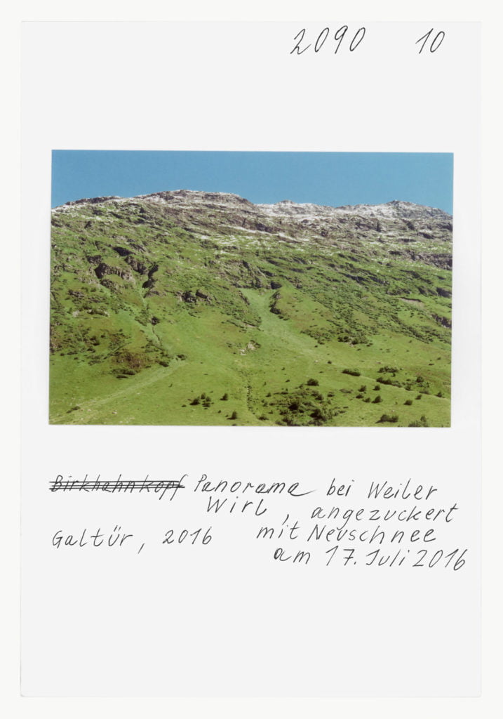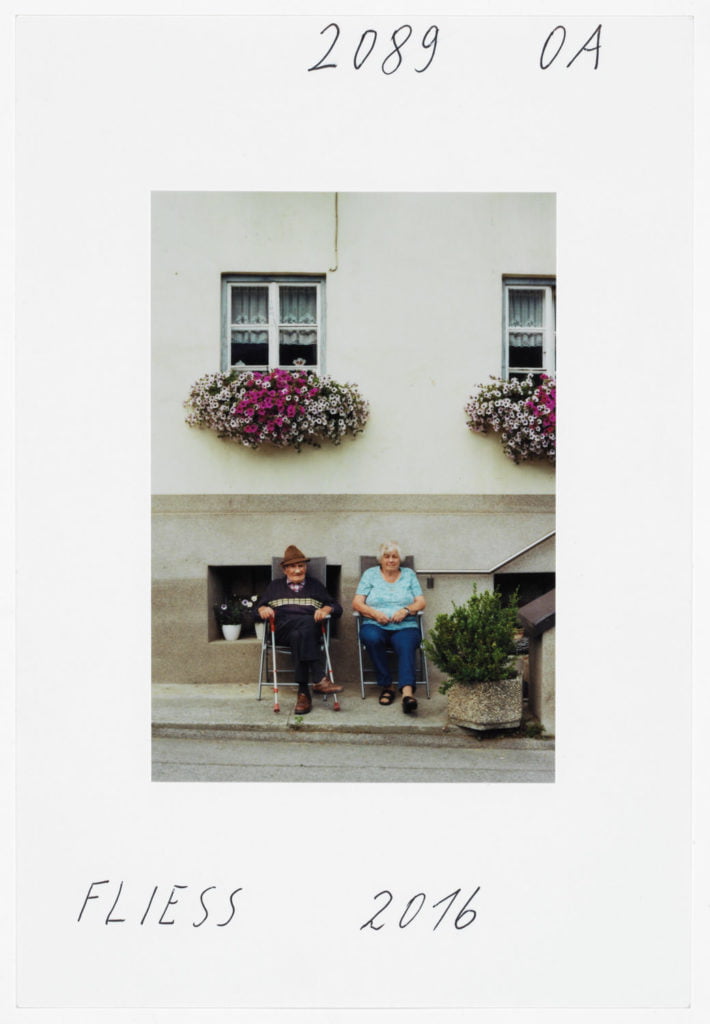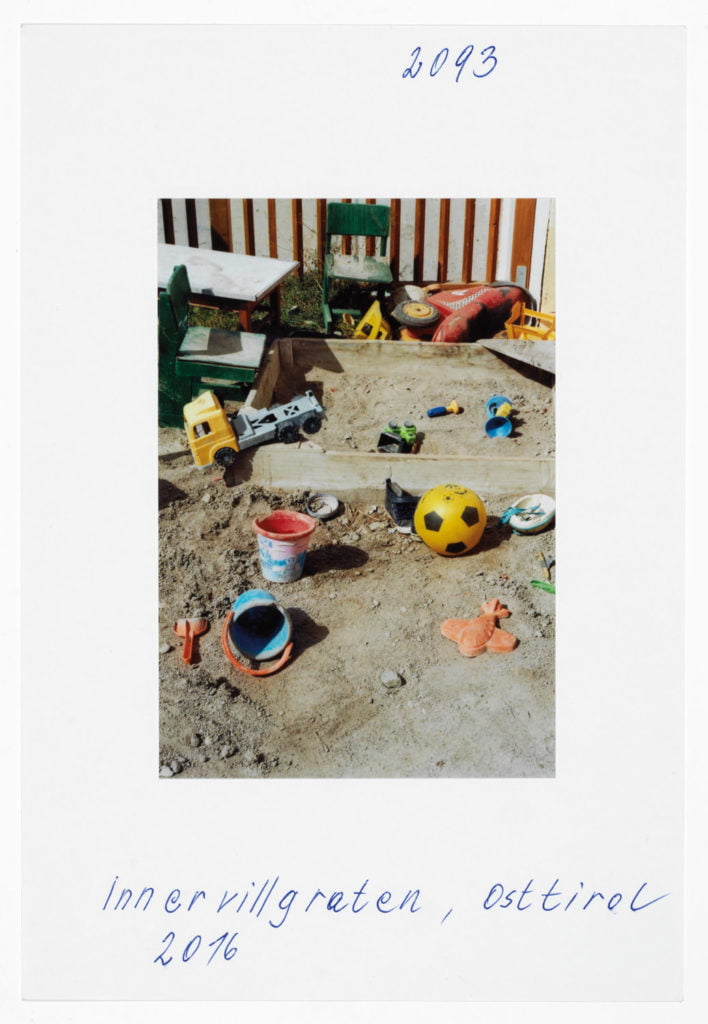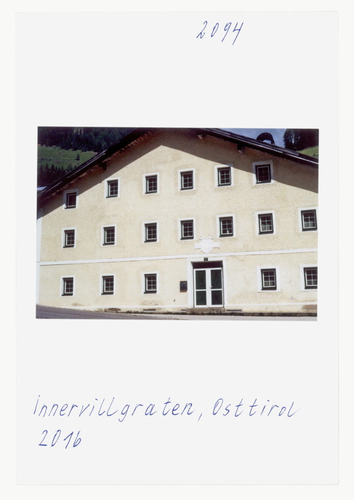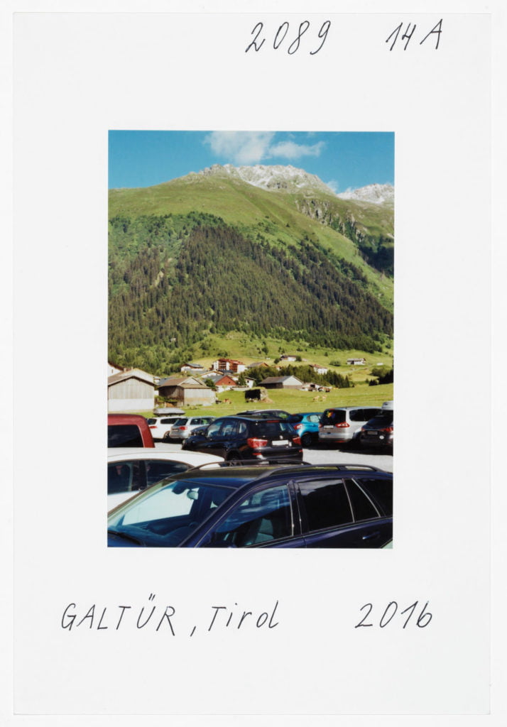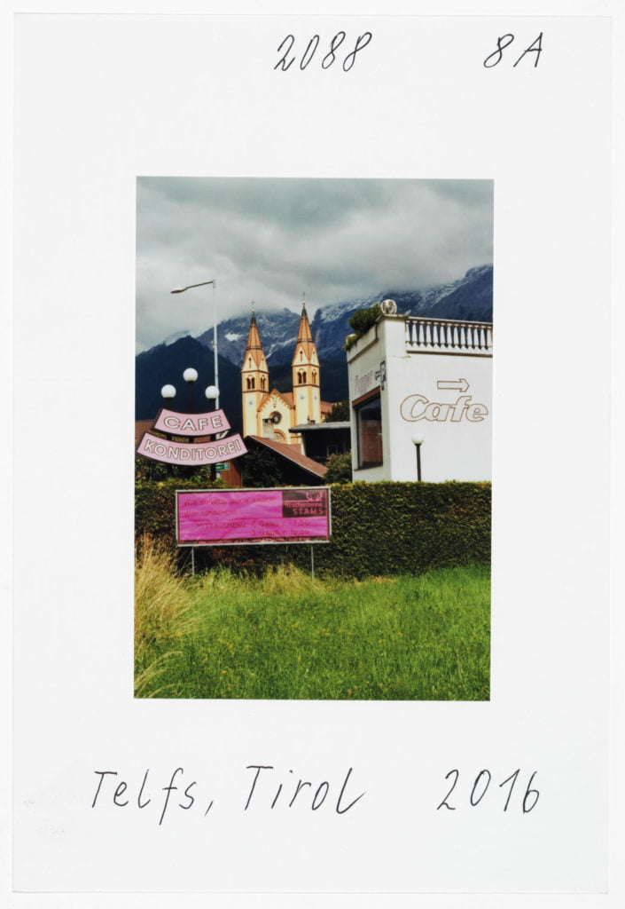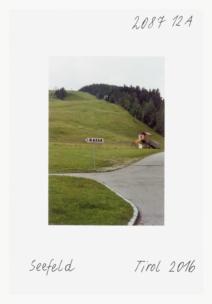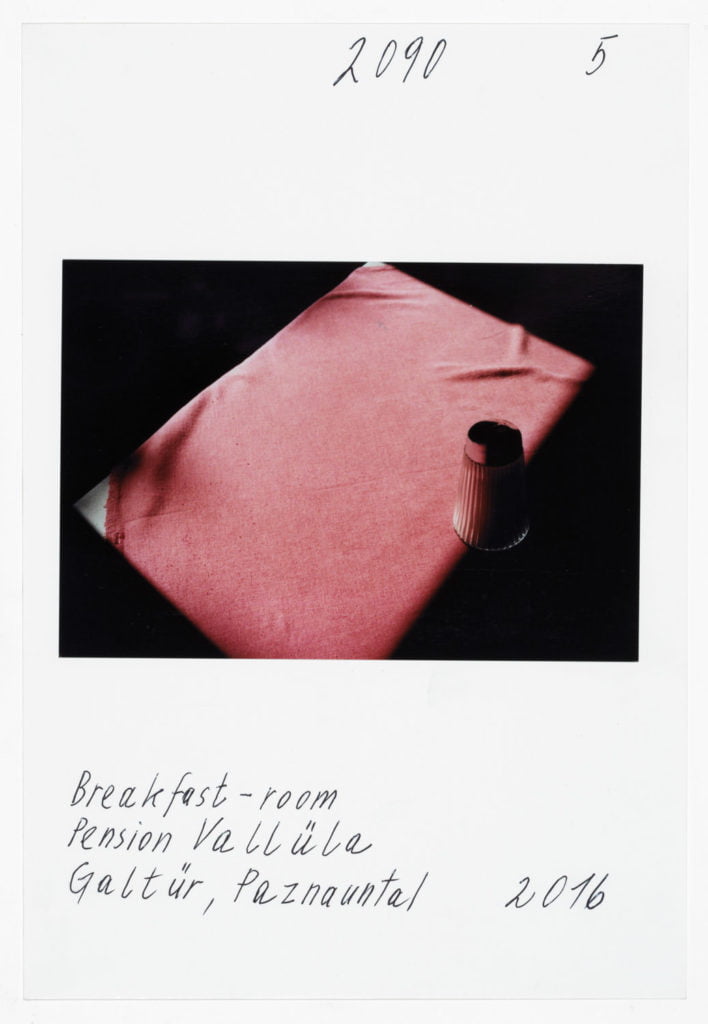 When he portrays two Muslims in front of the church in Telfs, the woman in a headscarf, the man pushing a stroller, it’s as if he is paraphrasing well-known Tyrolean tropes by Alfons Walde. At first glance it’s as if we are in a Bosnian village somewhere. At a B&B in Galtür it’s a sugar shaker on a table that has caught his eye. Leitner’s references to American photographers such as William Eggleston and Stephen Shore are clear.